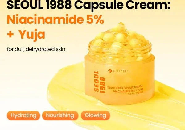 SEOUL 1988 Capsule Cream con Niacinamida 5% y Yuja es una crema facial iluminadora e hidratante diseñada para mejorar el tono desigual, la pigmentación y la textura apagada. Su innovadora tecnología en cápsulas libera los activos de forma óptima, combinando niacinamida al 5%, extracto de yuja rico en antioxidantes y ácido hialurónico multipeso para una piel visiblemente más luminosa, uniforme y jugosa. Ideal para piel seca, apagada o con manchas que busca brillo saludable sin sensación grasa.